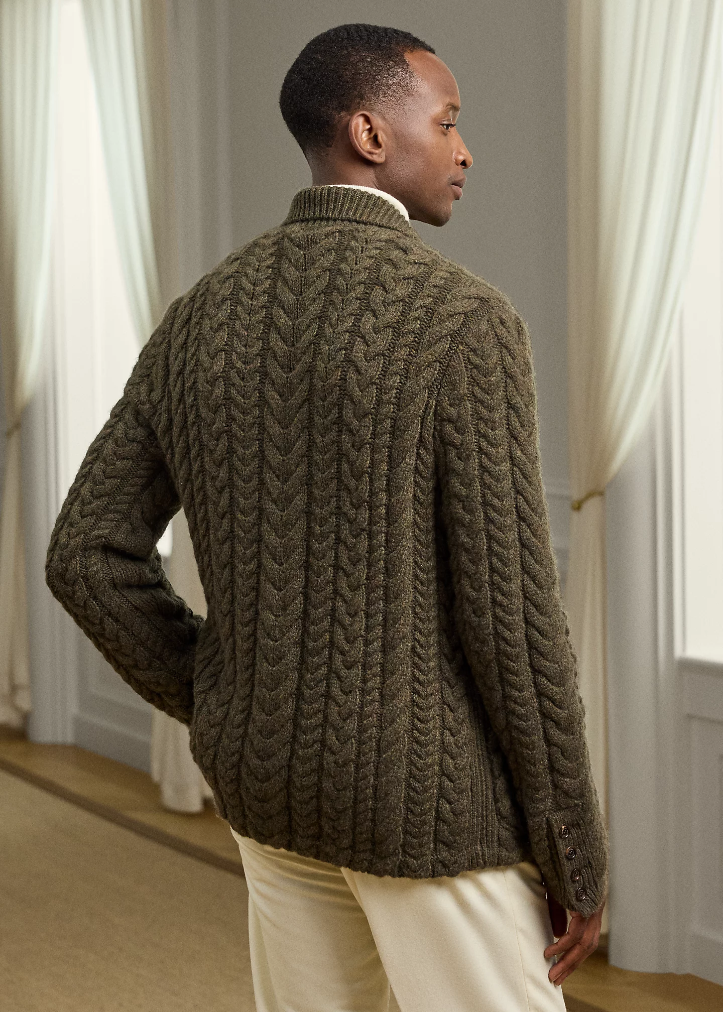 - Notch lapels. Three-button silhouette. Genuine horn buttons custom-developed with a “ralthtph lauthtren” logo.