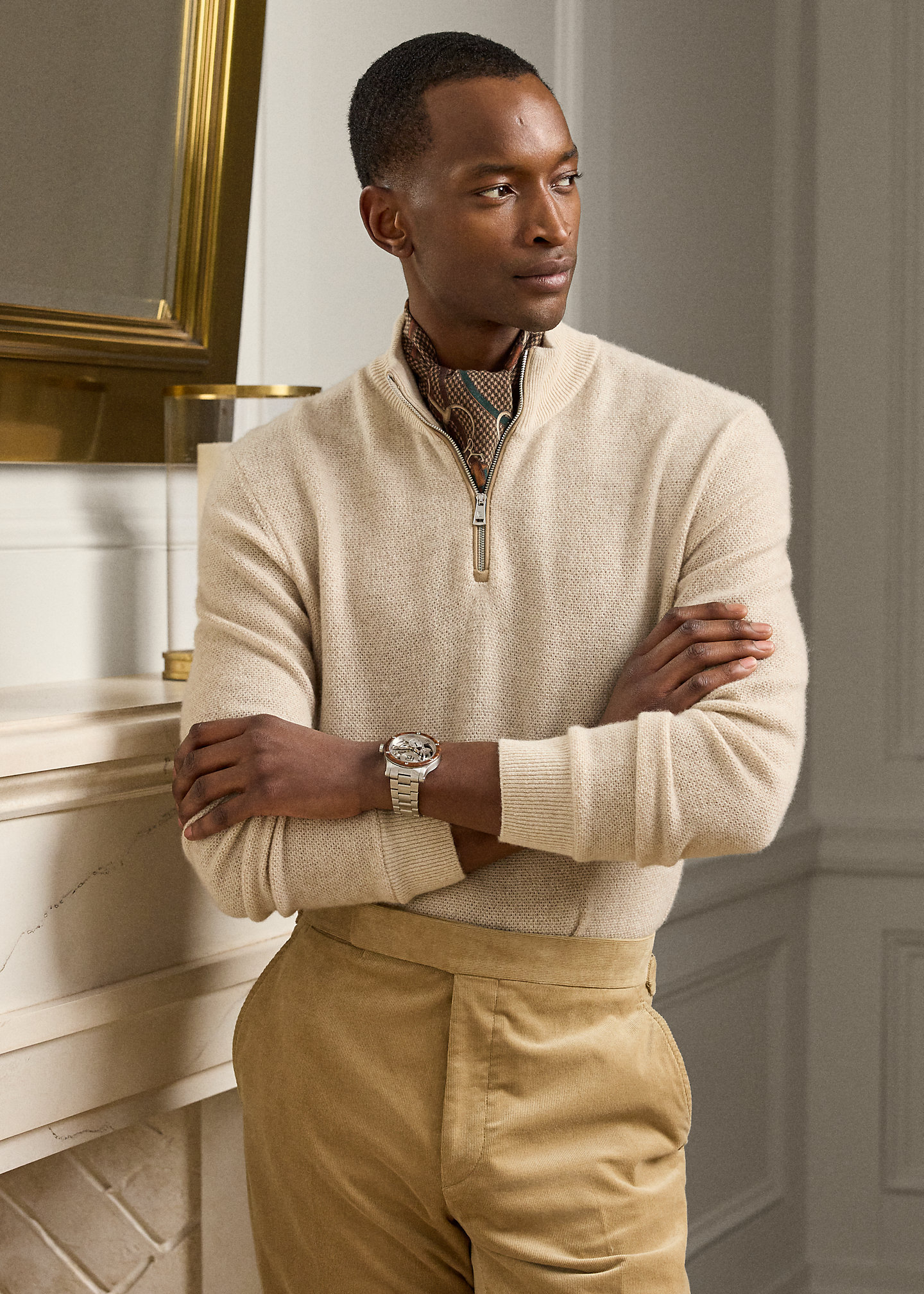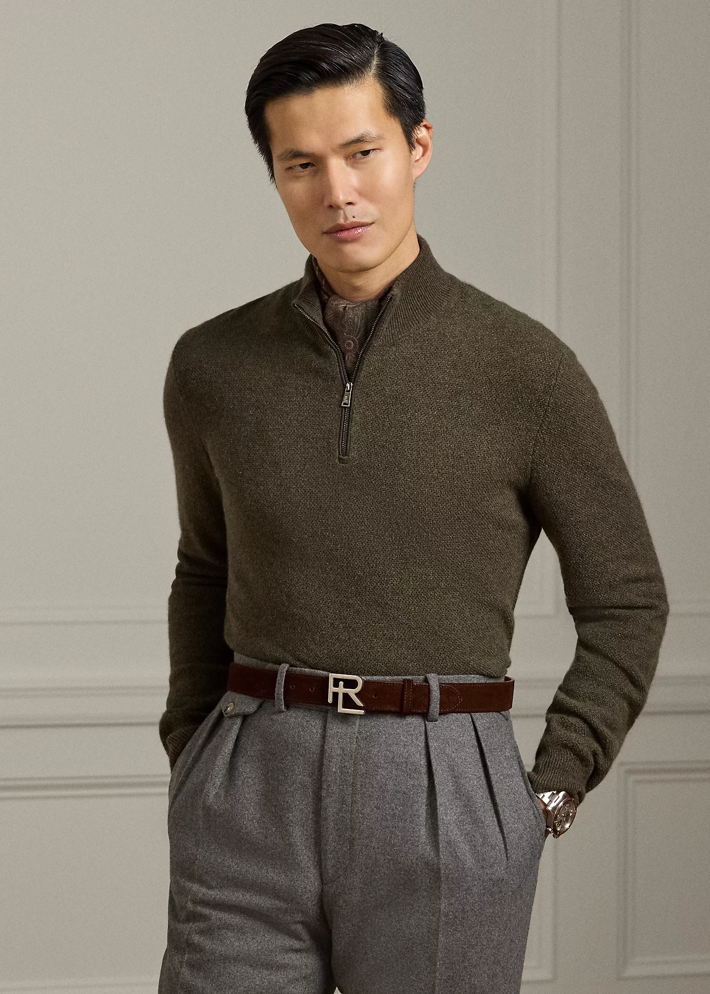 - Rib-knit mockneck. Quarter-zip placket with suede trim. Zipper pull custom-developed with an "RL" logo.