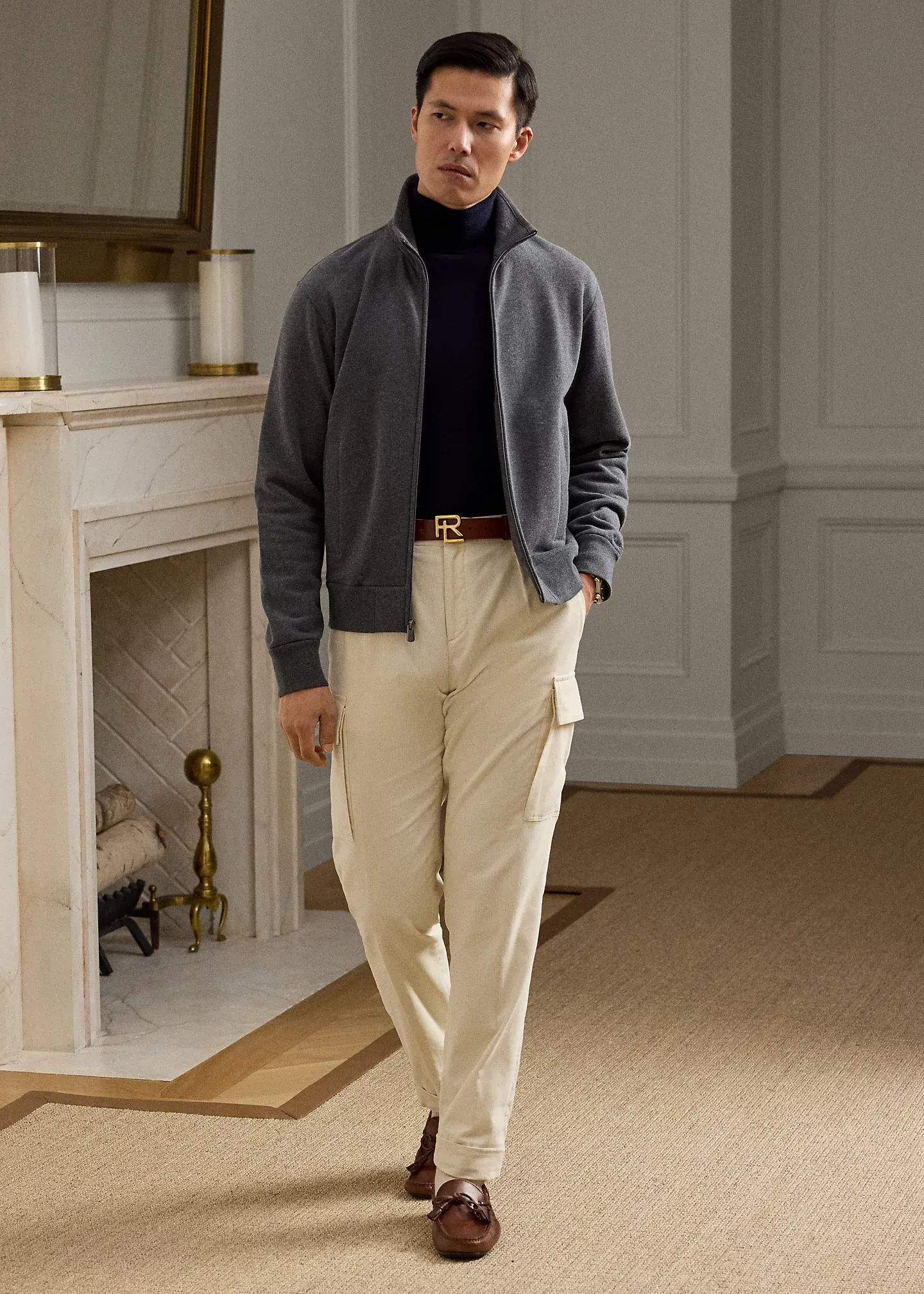- Mockneck. Full-zip front. Zipper pull custom-developed with an “RL” logo.
