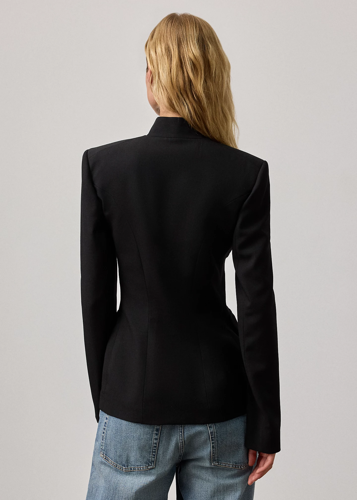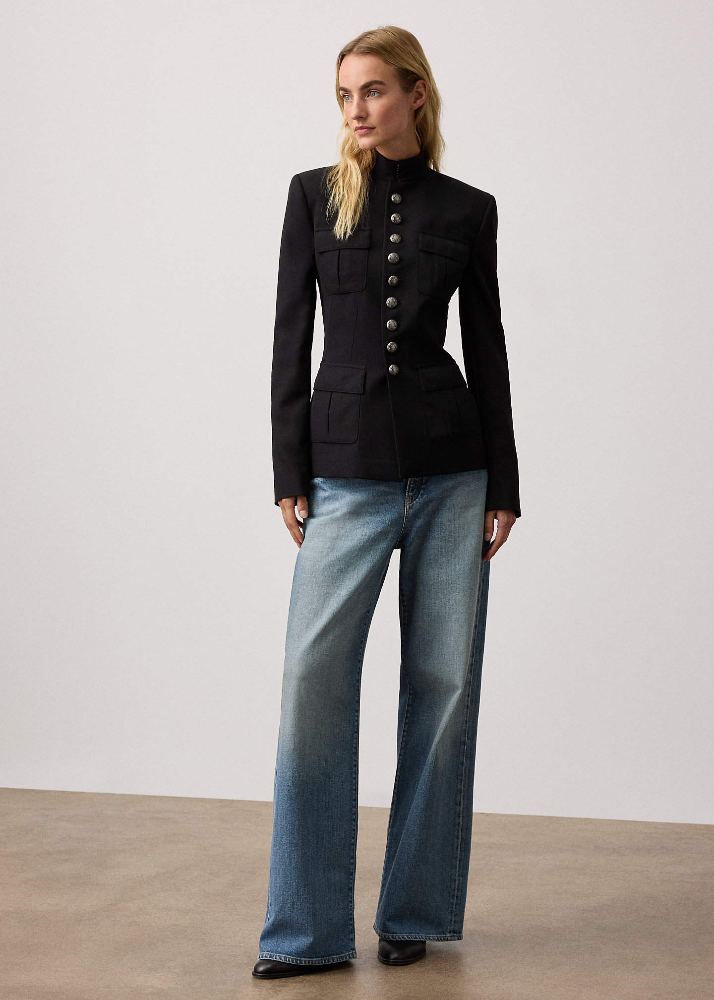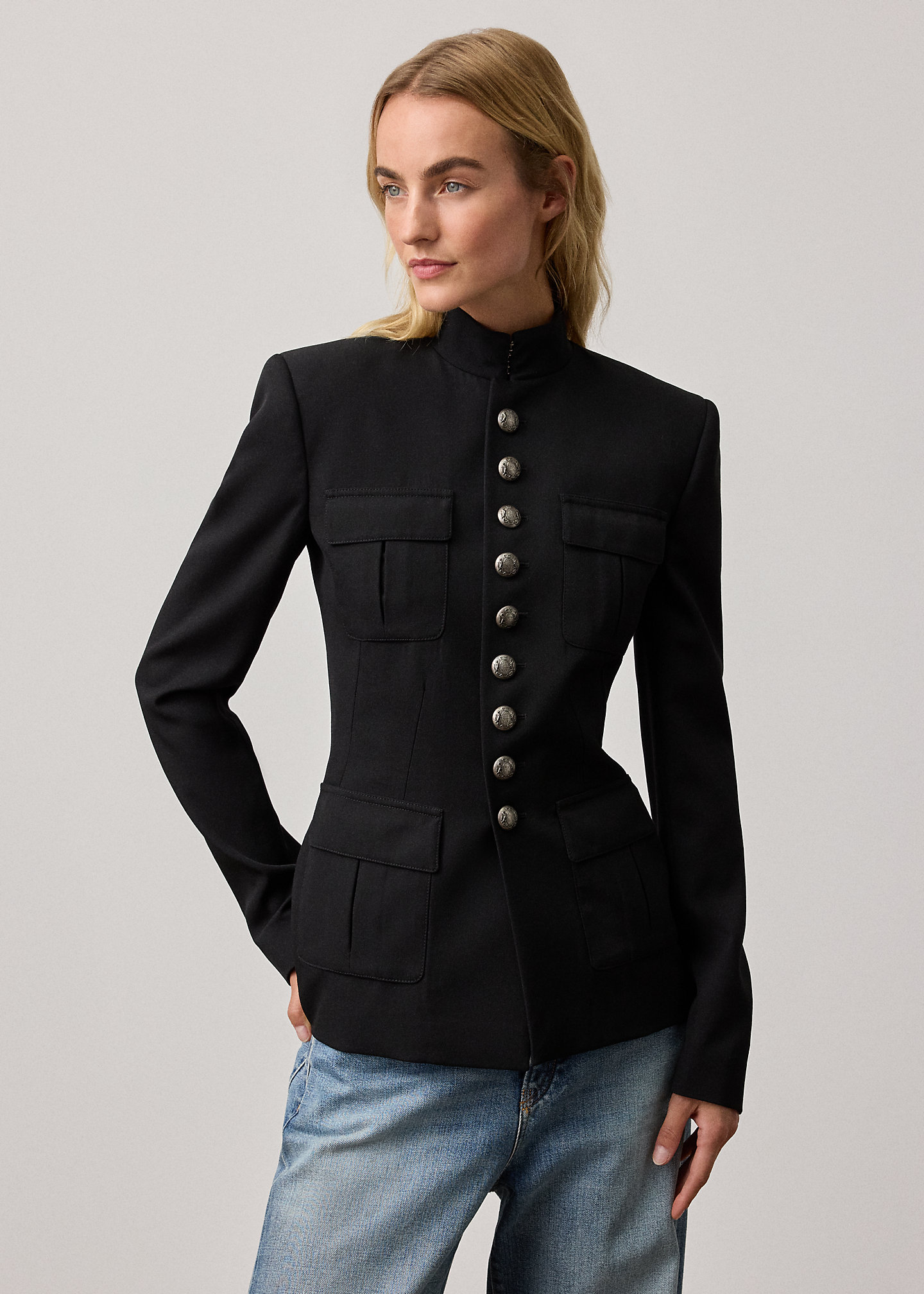 - Stand collar with three hook-and-eye closures. Buttoned placket. Metal buttons custom-developed with a signature crest.