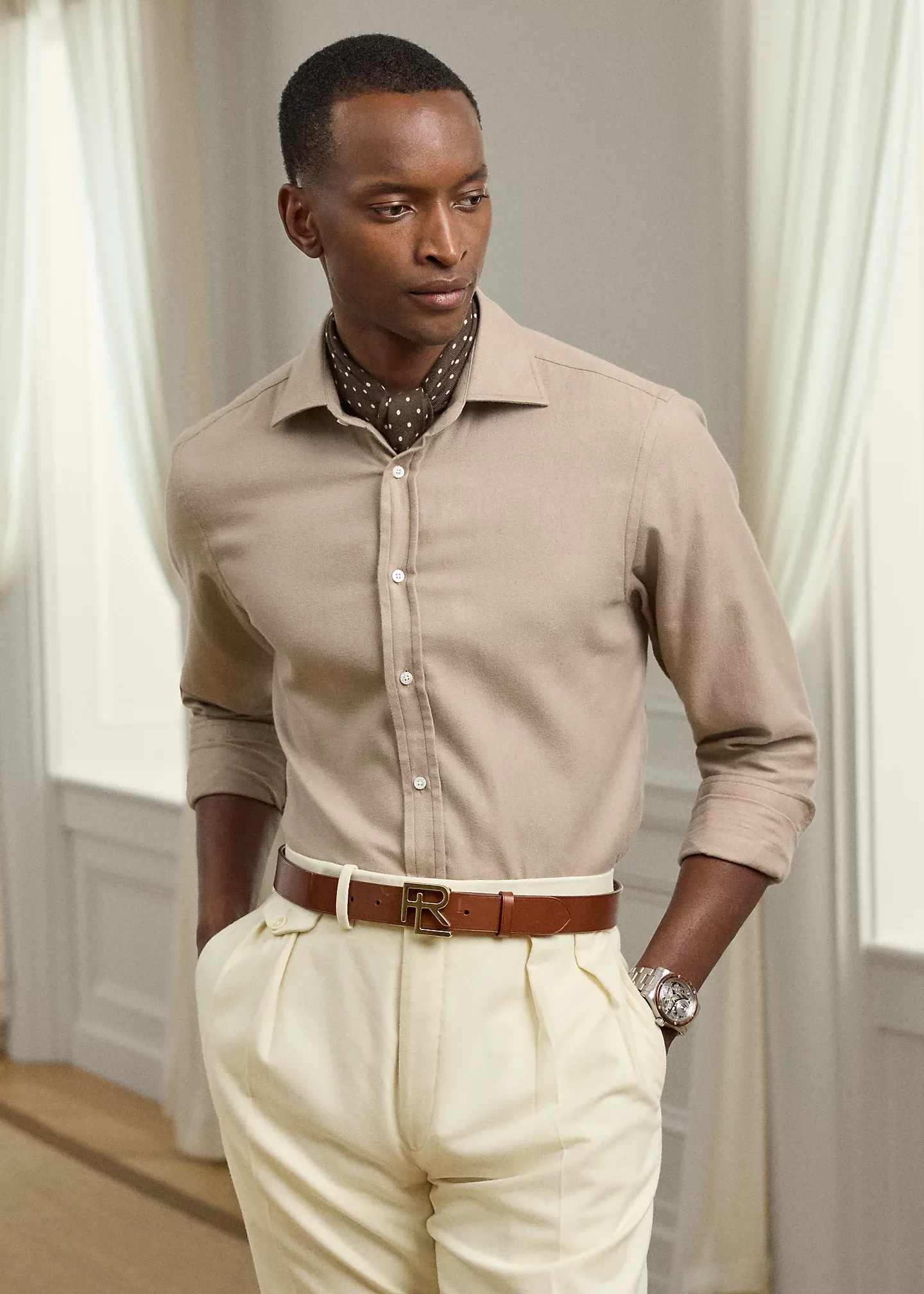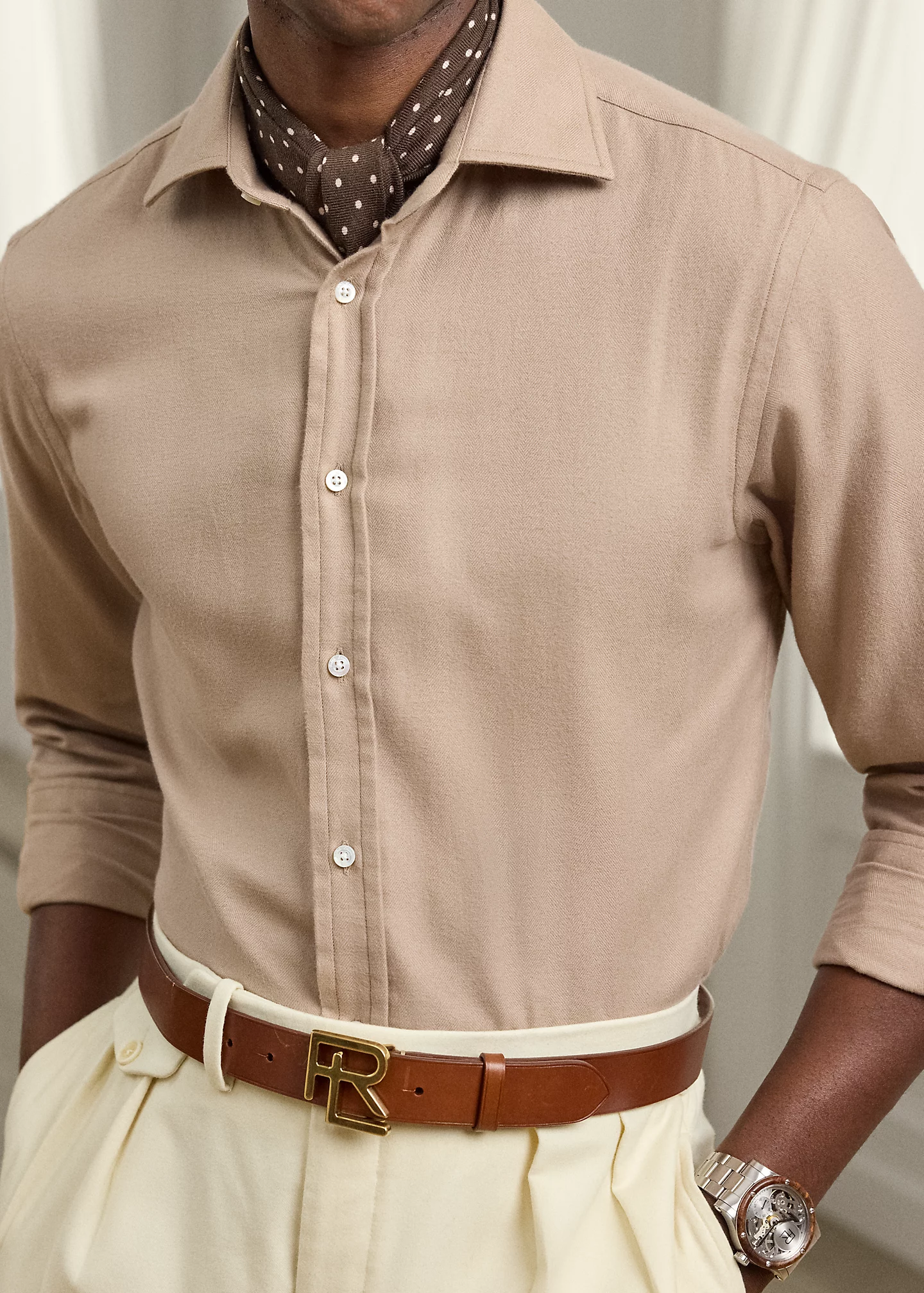 - Long sleeves with buttoned barrel cuffs.
