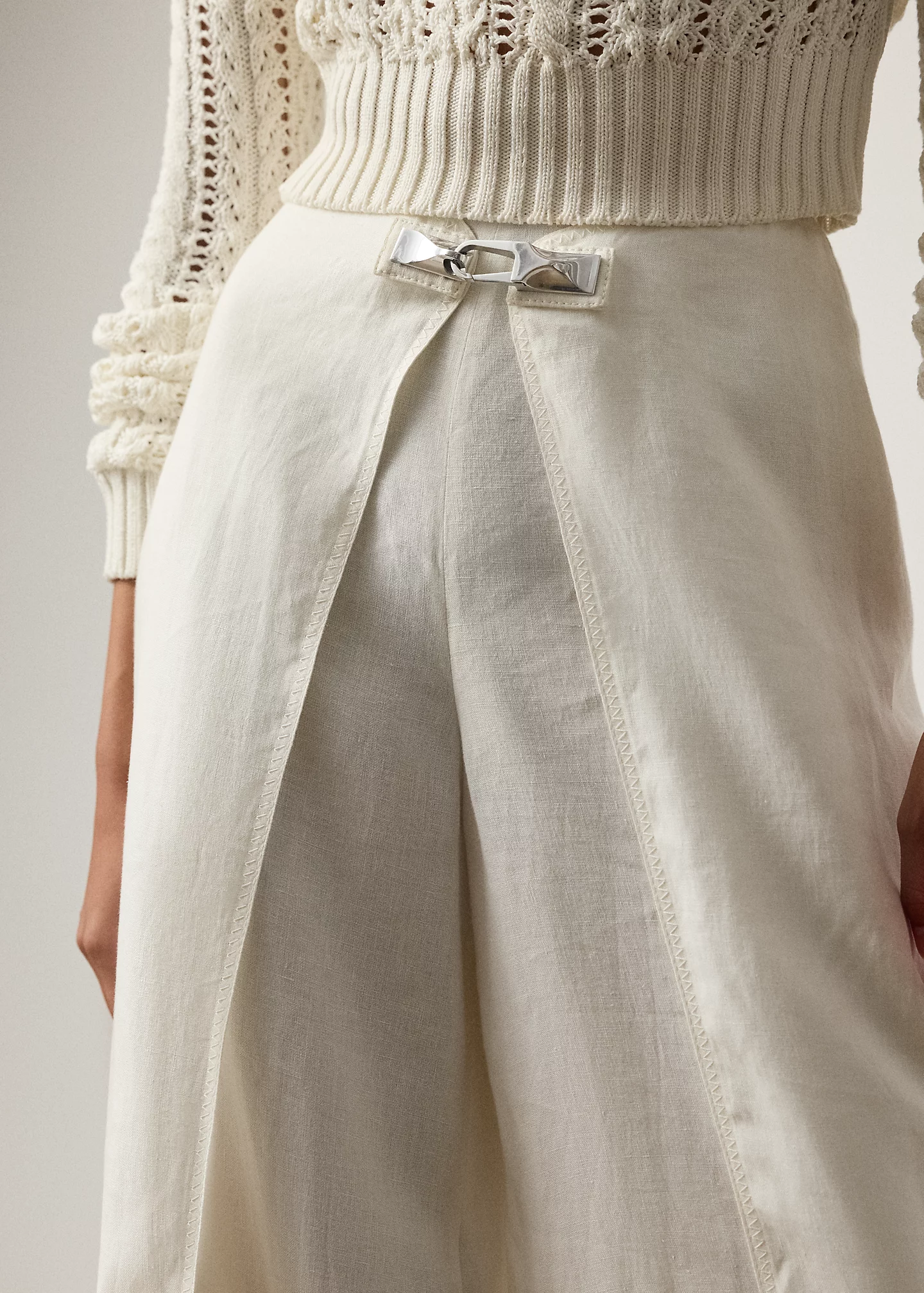 - Overlapping panels at each leg secure at the waist with a metal clip closure. Zigzag stitching along the panels.