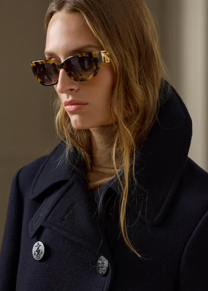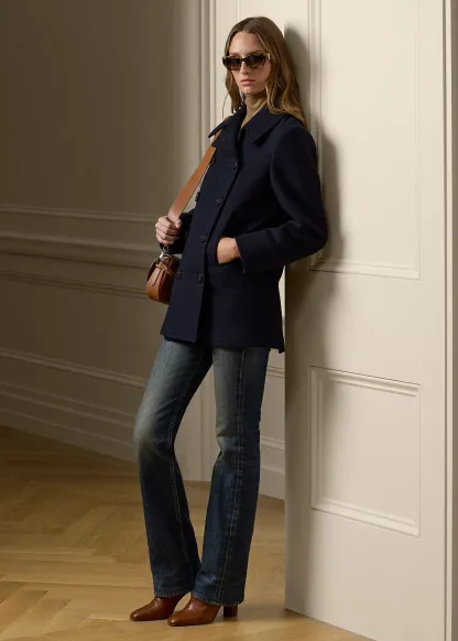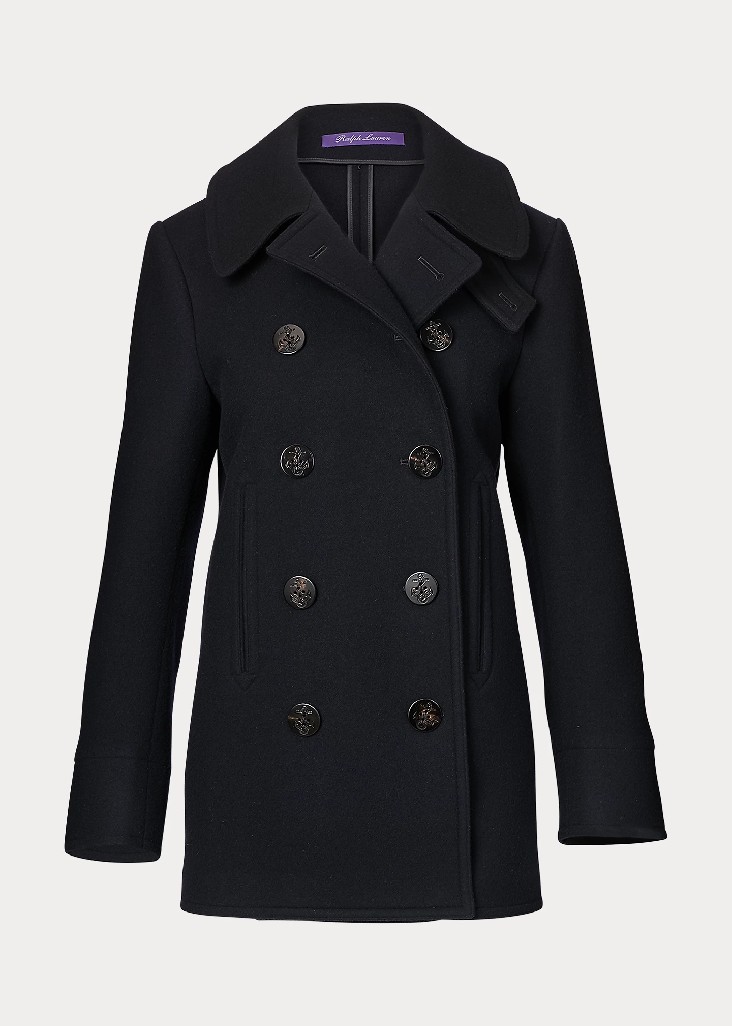- Spread collar. Trapunto stitching at the undercollar. Adjustable throatlatch. Double-breasted silhouette. Genuine horn “RL”- and anchor-engraved buttons.